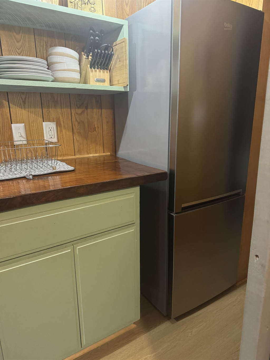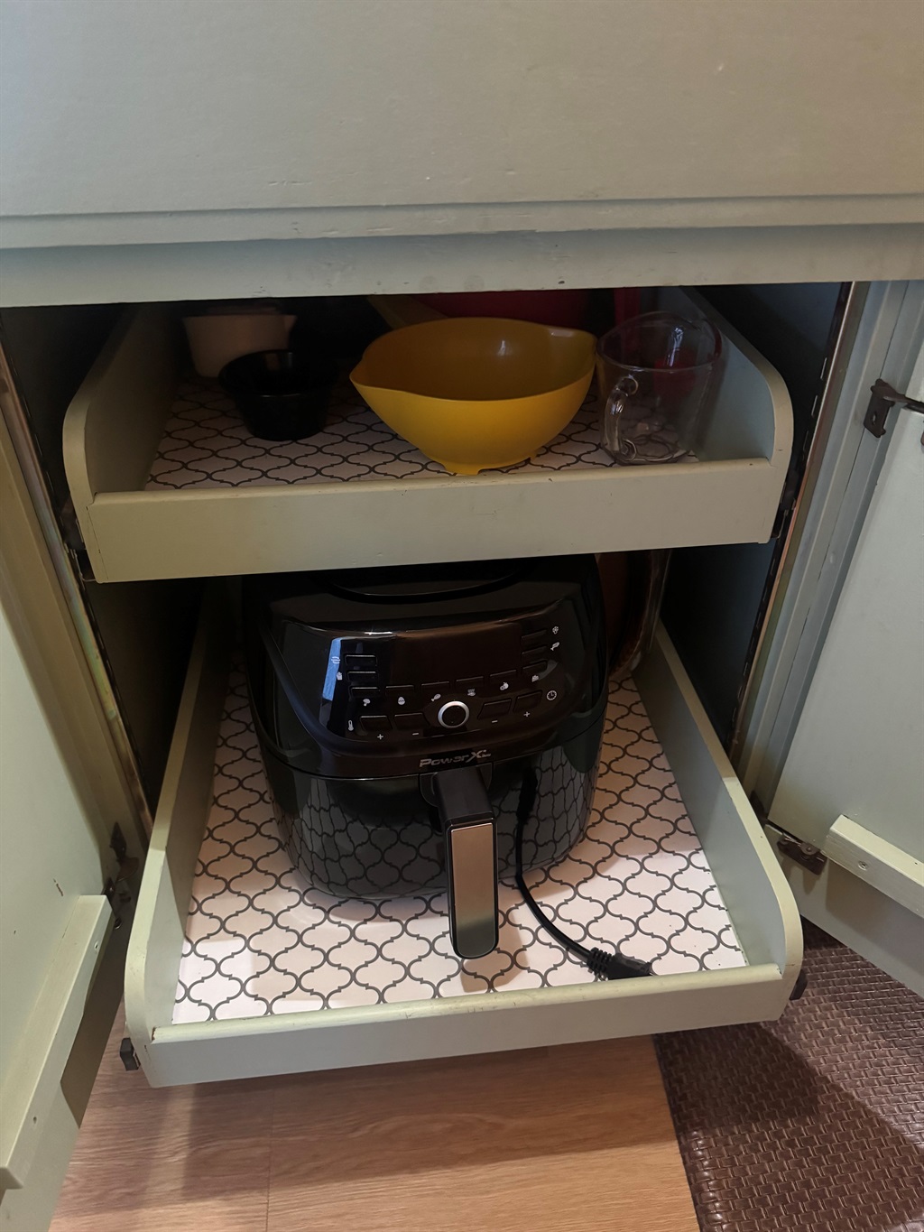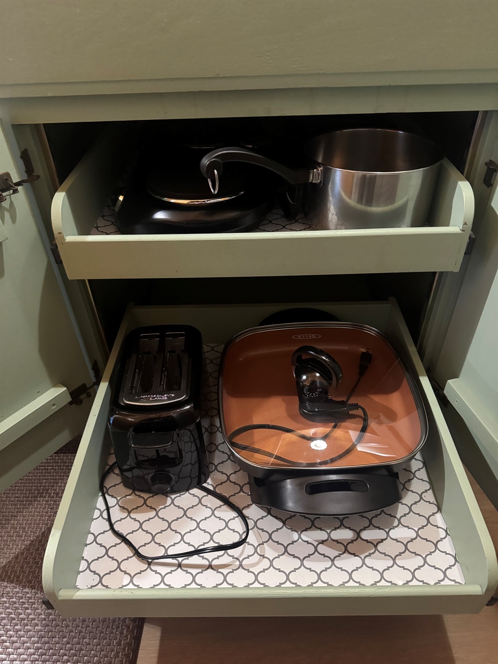 Eat: Kitchenette with air fryer, electric skillet, microwave, double burner electric hot plate, refrigerator with ice maker, toaster, coffee bar and electric kettle