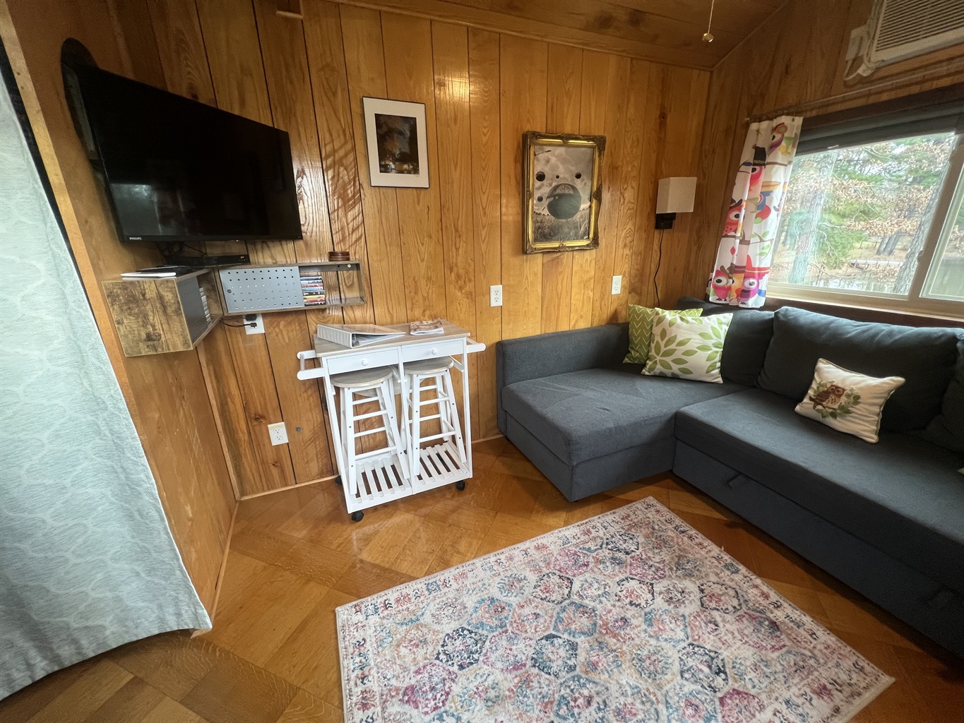 1 Bedroom • 1 Bathroom 1 Bath • Sleeps 2-4Unplug and unwind at our 240 sq ft custom-built tiny cabin on wheels, perfect for travelers seeking a serene escape by a 10-acre lake. Soak in the hot tub with stunning water views, fish from the shore, or stargaze by the fire pit with s’mores.